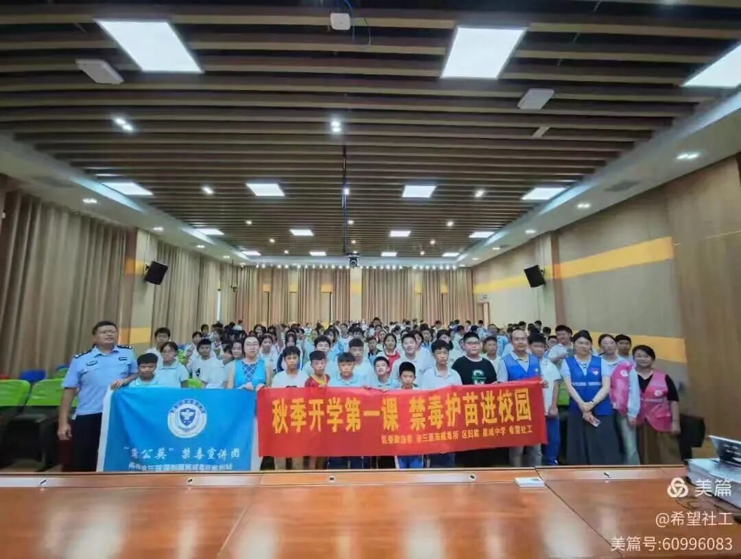 共青团三亚市崖州区委员会、希望社工协助省三亚戒毒所、区委政法委以及崖州区妇联在崖城中学开展秋季“开学第一课,禁毒护苗进校园”活动。