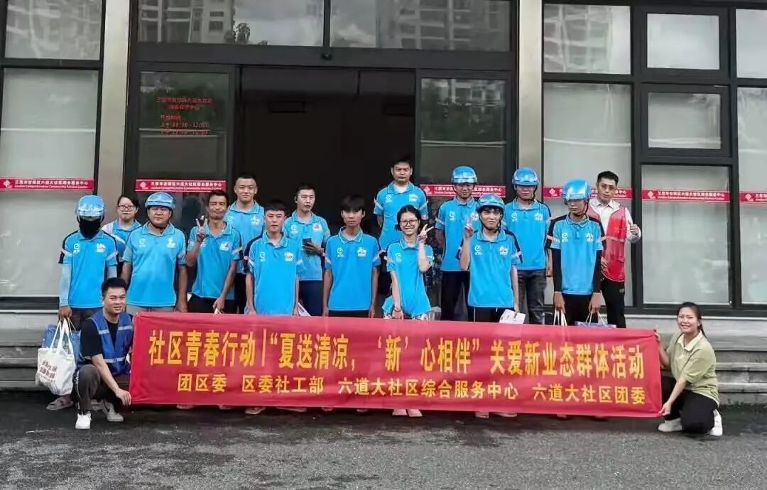 共青团三亚市吉阳区委员会在六道大社区开展“夏送清凉,‘新’心相伴”关爱新业态群体活动,为15名坚守岗位的外卖骑手送上防暑物资与暖心关怀。